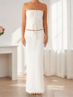 Women Summer 2 Piece Outfits Drawstring Bandeau Crop Tops and Elastic Long Skirt Set for Streetwear Aesthetic Clothes