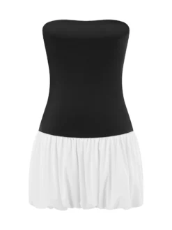 Women Strapless Mini Dress Summer Solid Color Puff Bubble Party Dress for Cocktail Beach Streetwear
