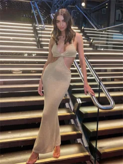 Women Summer Long Dress Sleeveless V Neck Hollow Out Bodycon Dress Bohemian Sexy Club Beach Dresses Y2K Aesthetic Clothes