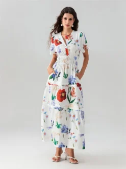 Women Print Long Dress Smocked Waist Button V Neck Short Sleeve Ruffle Hem Flowy Dresses Summer Holiday Casual Loose Dresses