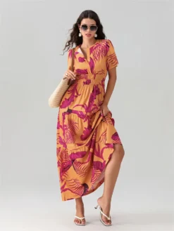 Women Long Dress Smocked Waist Pintucked Hem Side Slant Pockets V-Neck Short Sleeve Flowy Dresses