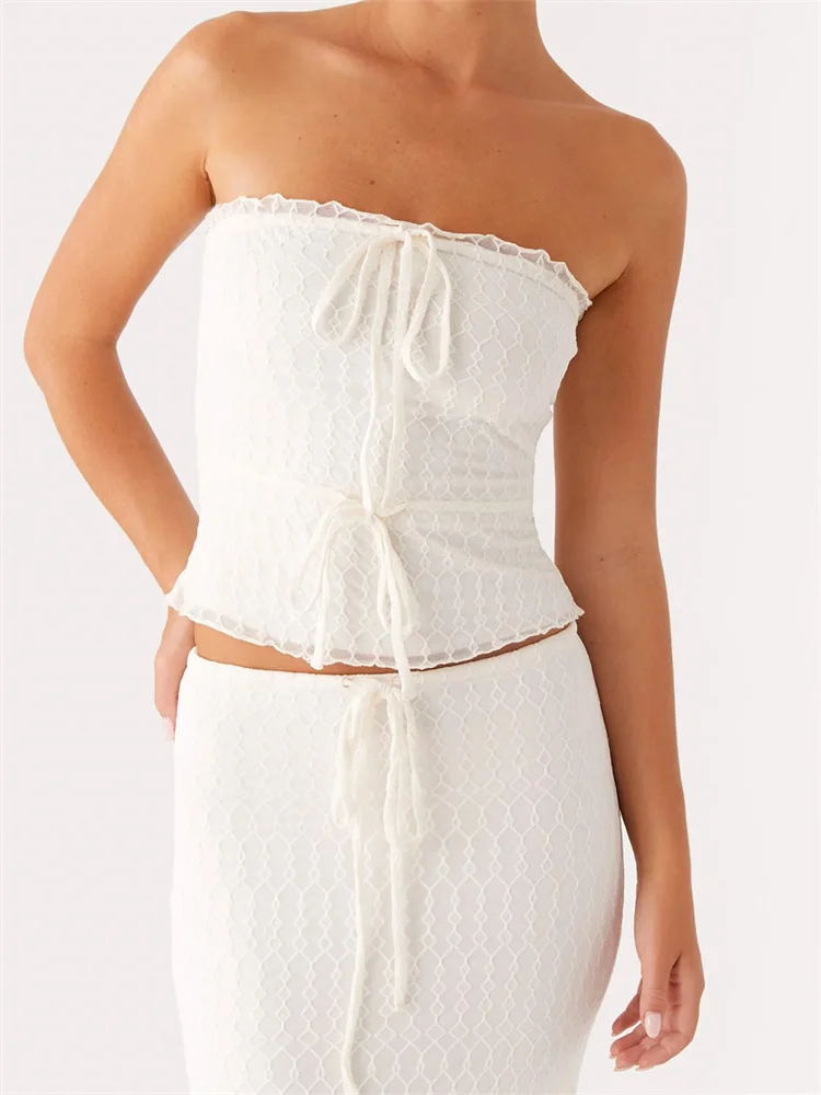 Summer outfit for women in solid colors; Women’s bandeau with drawstring front, strapless, crop length; Women’s skirt with elastic waist and drawstring, ankle length to show off your charming curves